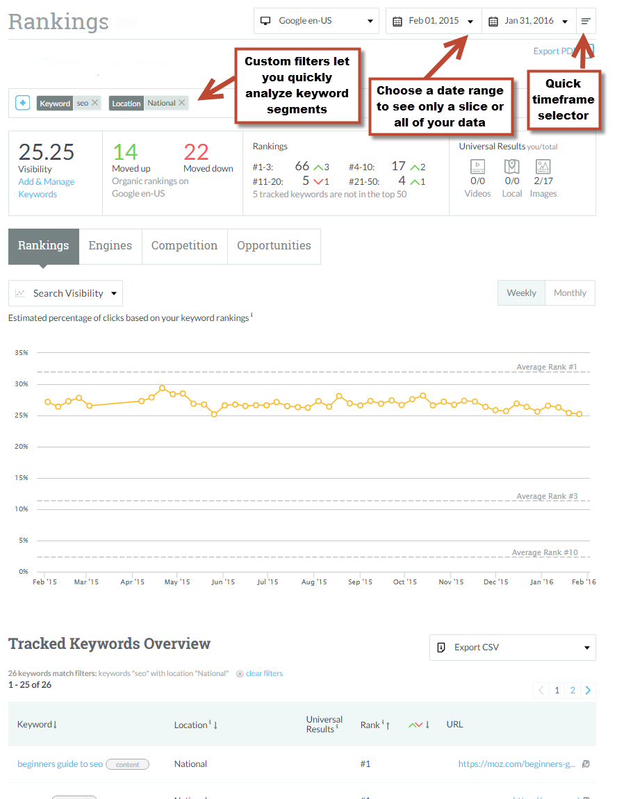 This will also allow us to build in some more powerful features in the near future, making rankings much more usable if you track a lot of keywords. We are officially launching this update next week, but the engineering team was a little impatient — and so we quietly launched these improvements today. If you’re already a Moz Pro customer, go to your campaign rankings page to see these updates right now!