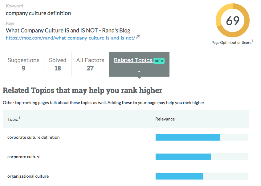 Along with keyword research, topical analysis and optimization has become an important focus for SEOs. Moz’s Data Science team has built out a great service to analyze and extract topics from any page on the Web. We will soon offer this service in Moz Analytics campaigns to help you discover topically-related keywords based on competitors in the SERP. Adding these keywords to your pages can help search engines identify your pages’ topic and intent, and help you rank for a broader set of queries.