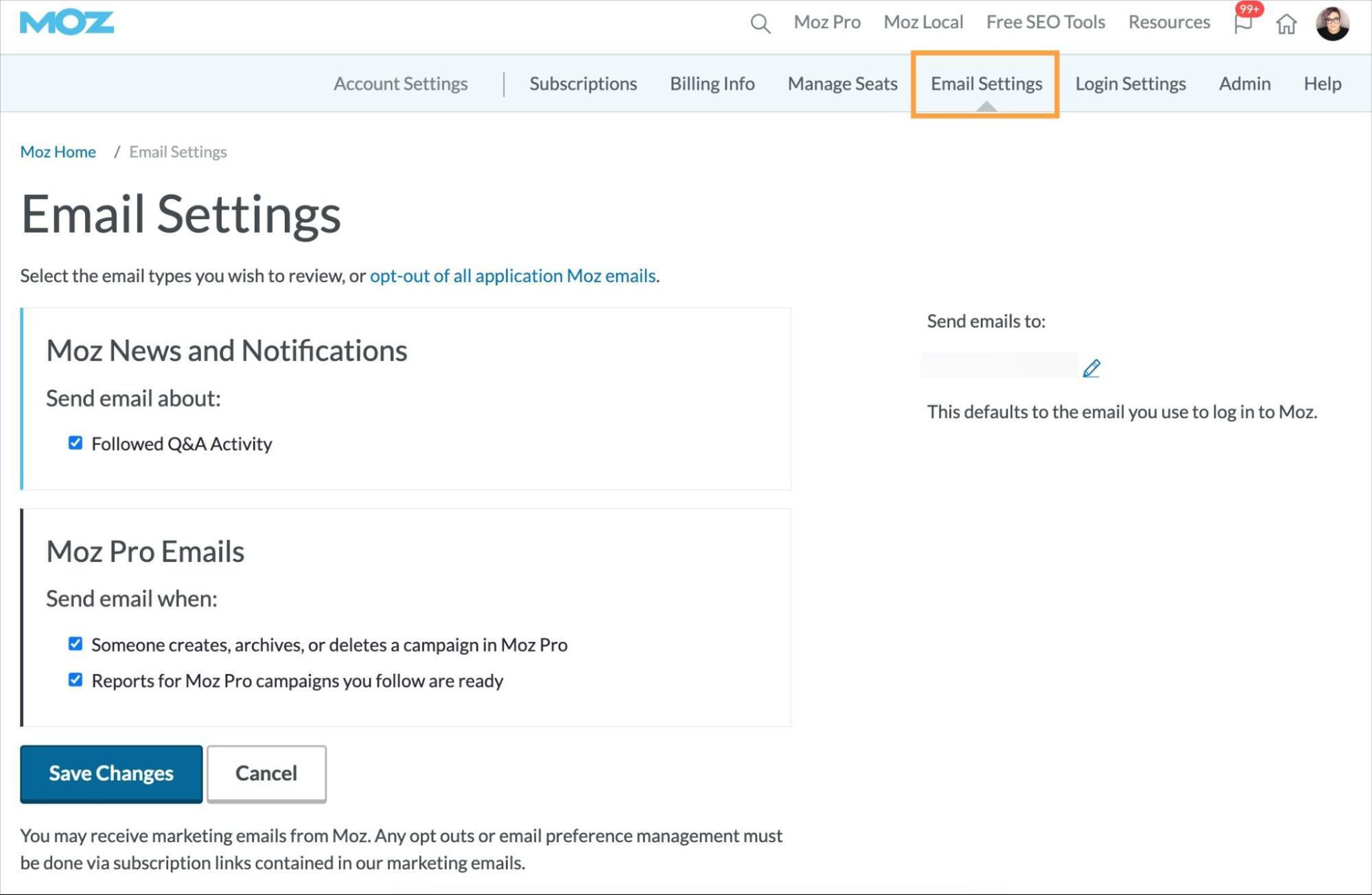 If you’ve inherited your Moz account and subscription from someone else, it’s a good idea to take a moment and check your email settings. The person before you may have opted to not receive Campaign-related emails or they may have turned off email notifications for Q&A activity. You can check your email settings at any time from the Email Settings view of your Account & Billing section.