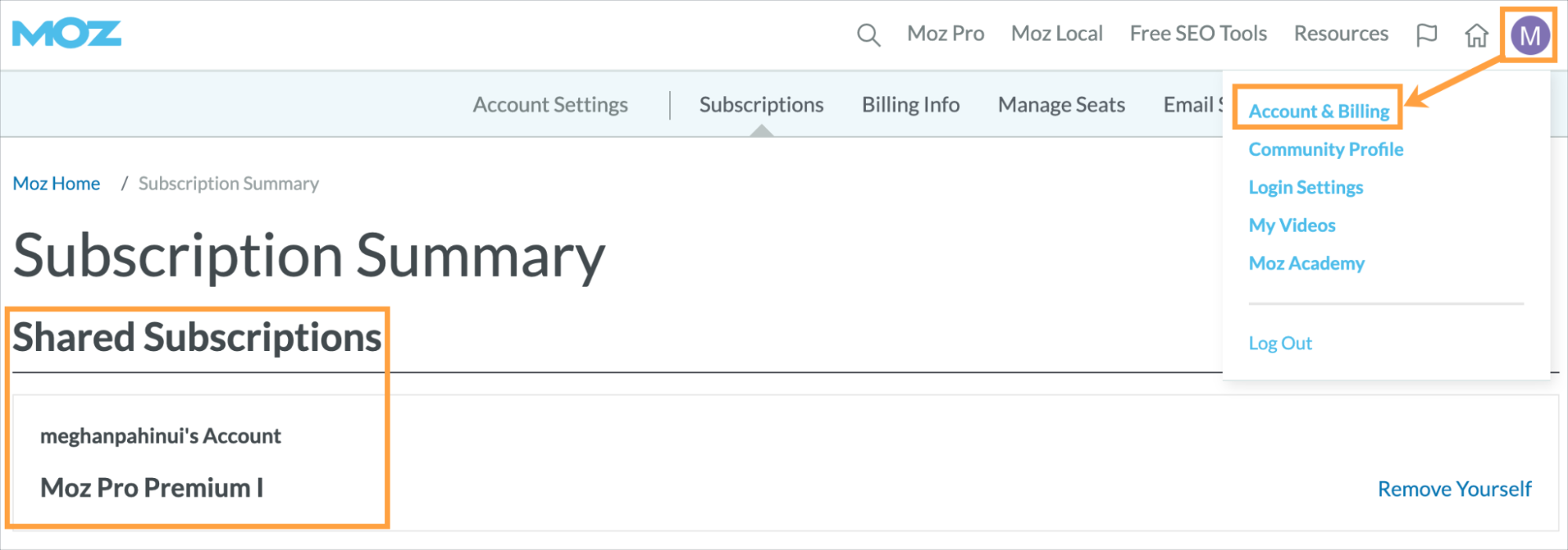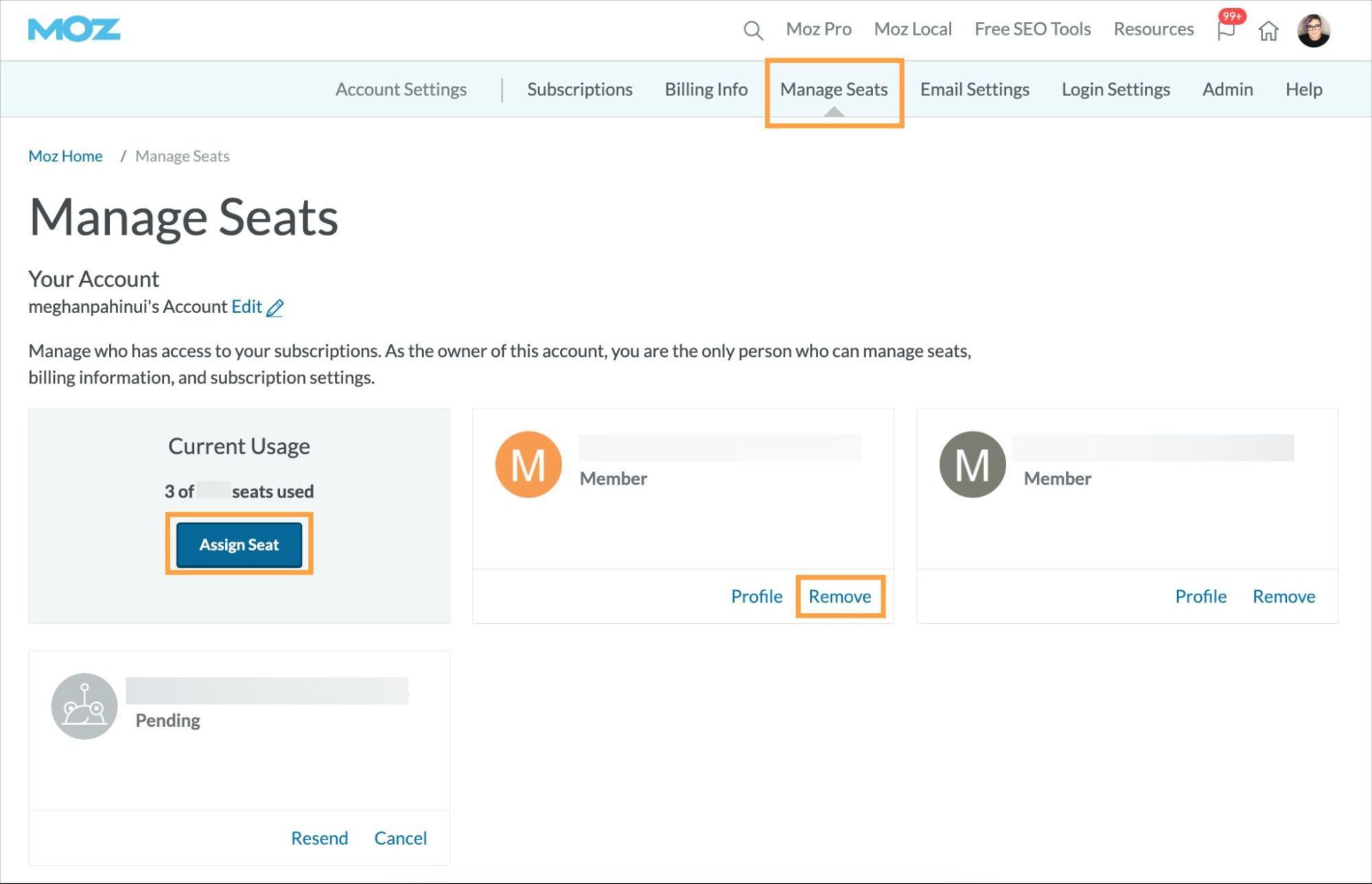 As teams shift with new members joining and folks leaving, it’s key to make sure that the right people have access to the Moz tools. Check who currently has access to your toolset in the Manage Seats section of Account & Billing. From here, you can remove seated users and assign new seats. If you see a notice that you do not have a subscription for which to manage seats, this means you are a seated user on another subscription and will need to reach out to the owner to make any changes.