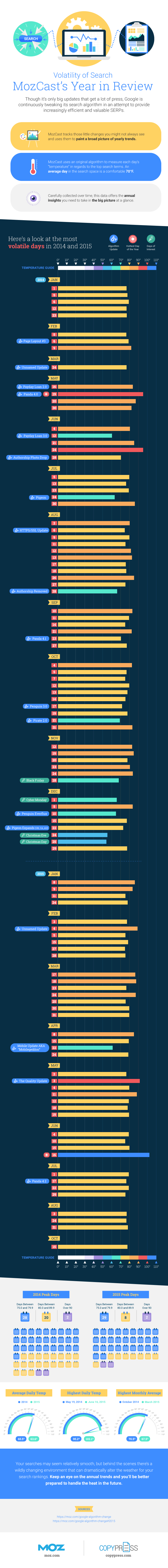It's been 3 1/2 years since we launched the MozCast project, and one request I hear a lot is if we can make more than 30 days worth of data available. So, working with Dave Snyder and the team at CopyPress, we've put together the highlights of 2014 and 2015 — the confirmed algorithm updates you already know, and the ones you might have missed. The data is mine, but credit for everything else goes to CopyPress (Thanks, Dave!). If you have any questions about specific events or dates, feel free to comment, and I'll do my best to follow up with any available data.