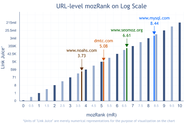 But typically one uses PageRank of the homepage to measure this. PageRank doesn't do a bad job of this, but it's not directly measuring this effect. Inside Linkscape (and exposed on the mozBar), we show Domain mozRank, which does directly reflect this, on the same kind of a scale described above.