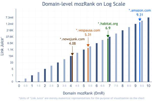 You'll notice the Y-axis is showing a hypothetical Link Juice metric on a log scale. So where we have mozRank 4, you'll see that corresponds to a hypothetical link juice value of 599, and mozRank 5 corresponds to 5,000. This just reflects the relative effort to get these mozRanks, whether this be links, authoritative endorsements, etc.