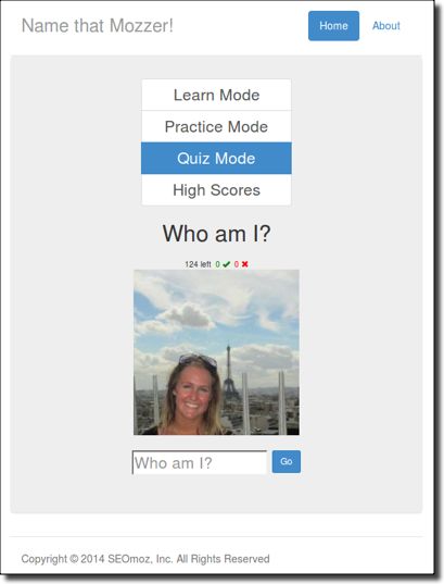 Our top-rated Ship It Week project is a tool that helps you learn the names of all the Mozzers, called "Name That Mozzer." It was built as an internal tool only, to help staff get to know others on the team. A big thanks to Brandon for all the work he put into making Moz a better place!