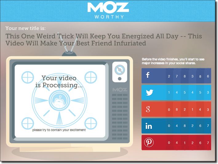 Once you submit your video, we take it and process both the video and title. Using super-special Moz data based on what words are the most clickable and linkable, we create a viral title for you. A combination of your title, attributes you added, and the addition of "highly viral keywords" will be used to make your title as ahhMOZing as possible.