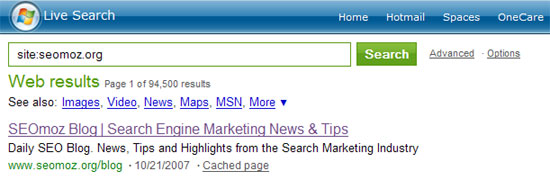 I'll use SEOmoz as an example. Searching for "site:seomoz.org" returns 94,500 results: