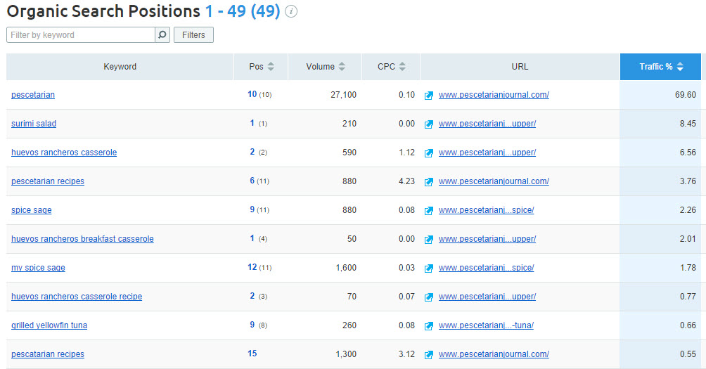 As well as using SimilarWeb, I took a lot at the keywords that were bringing through the most traffic from the search engines to my competitors' websites. I did this with SEMrush. Here's a snapshot of some of the terms specifically related to pescetarianism: