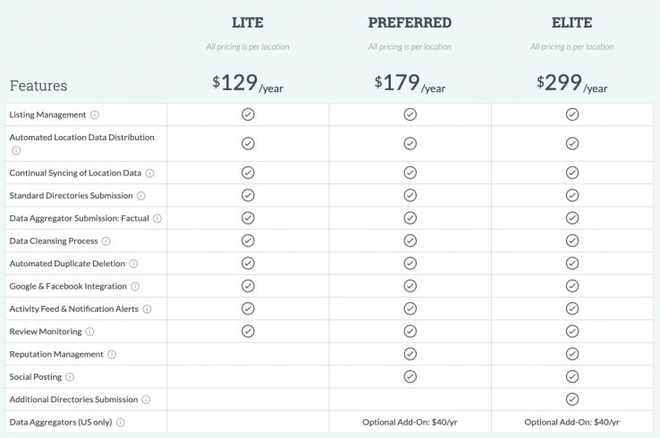 All three plans now include location data submission to Factual for broader location data distribution. Preferred and Elite subscribers in the US can add the other two data aggregators — Infogroup and Neustar Localeze — for $40 per year, per location.