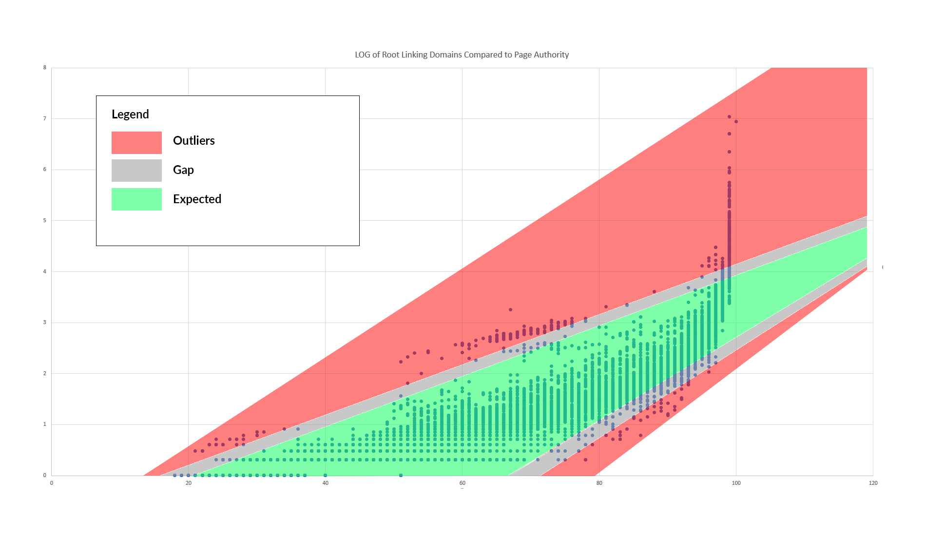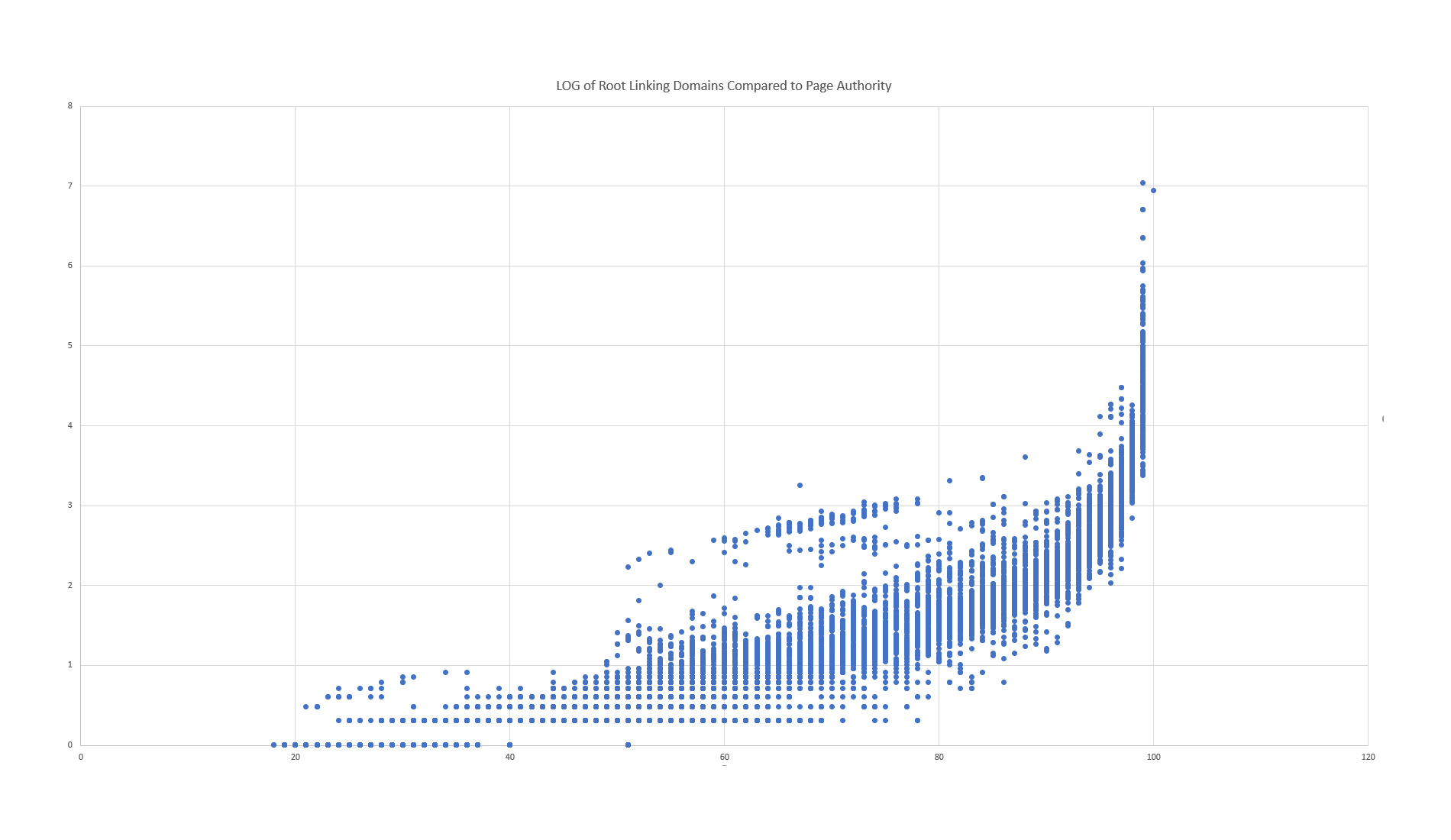 The last test involves comparing the current Page Authority to the new Page Authority, in order to determine if there are any bizarre outliers (where PA shifted dramatically and without obvious reason). First, let’s look at a simple comparison of the LOG of Linking Root Domains compared to the Page Authority.