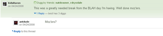 The original comment was clearly left by someone who is familiar with SEOmoz--he calls us "moz'ers." The response is from your average Joe Digger, who doesn't understand the reference and is confused by it. I've seen the same thing happen with submissions, too: