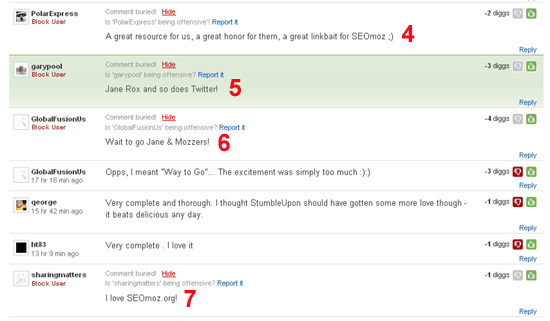 Let's go back to the Web 2.0 Awards submission comments. The actual awards are great--you know it, I know it, lots of us know it. But what does the average Digger see when he clicks on the submission and sees the comments? He sees a built-in community praising the author, SEOmoz, and talking about how this was great "linkbait." Most of you are fully aware of SEO's negative reputation, especially on Digg. Many stories that are SEO or SEM-centric or that are too marketing aggressive get buried pretty quickly because they're seen as spam. These comments all seem to come from a bunch of people who know each other and praise the successful "linkbait" (admittedly, a pretty spammy and negative-sounding term, even though we know that it's not necessarily the case) of the Web 2.0 Awards, so what's a Digger to think? I'd wager they say, "This is spam," hit the Bury button, and browse the rest of Digg. The bury not only hurts the story's chances of making it on the home page, it also isn't good for the submitter to be associated with what is perceived to be spammy content. The submitter's success ratio and reputation are compromised, driving him into a downward spiral of alcoholism and hard drugs (okay, maybe not, but it's still not good).