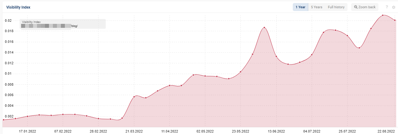 Now, most of their blog content is very tightly related to their products, and each new post ranks well and brings in qualified traffic. The site as a whole is seeing the benefit, and the visibility for blog content has been steadily increasing: