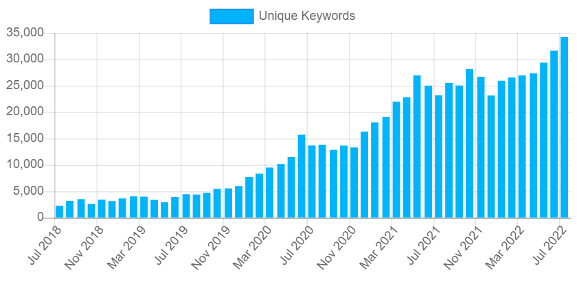 I’ve seen a client’s search rankings and traffic soar when they added a key page to fulfill one of their biggest keyword gaps. Overall, the unique keywords they rank for have increased by 47.92% during 2022, and 79.4% since we started working on their new and existing content using this semantic approach: