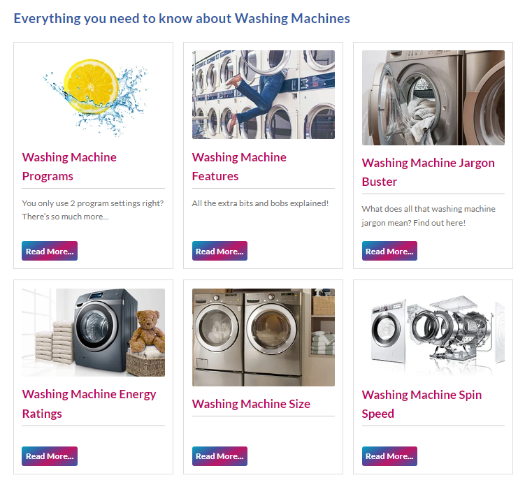 Here’s a hub and spoke strategy in action, organizing help and advice on washing machines around a central washing machine category page: