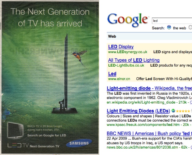 Or, like with this Samsung ad in the Metro today, you can just fail. If you're going to get customers to search for you, at least have something they can find! (Sorry the quality's not that great- if you can't read it, the Samsung ad tells me to 'Search on Google for LED').