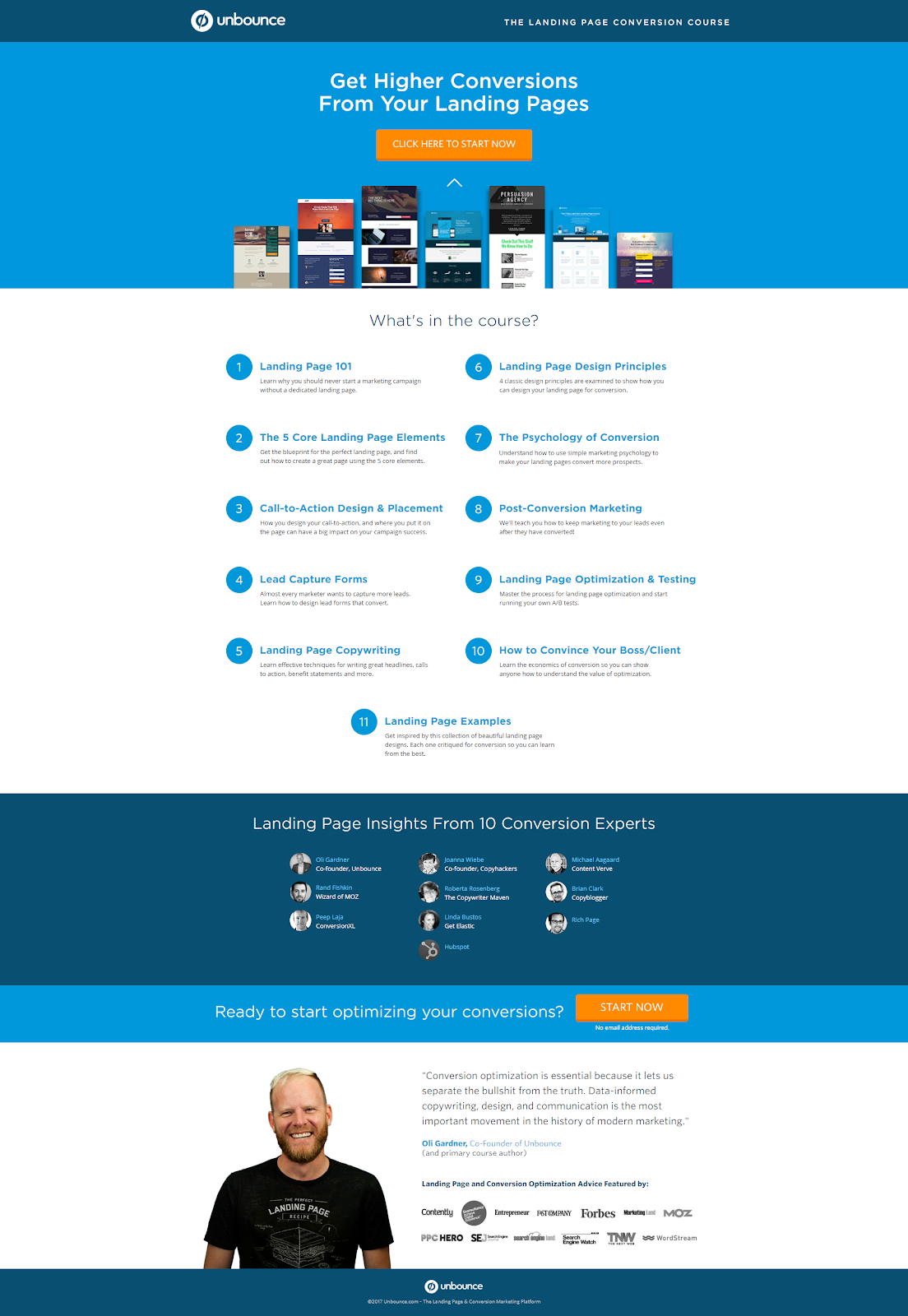 Here Unbounce use two CTAs (the orange buttons), but don’t rely on having the form on the page.