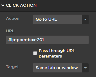 - Edit that button, in the “Click Action” section of the right-hand button settings panel, where you would normally put the URL you are linking to