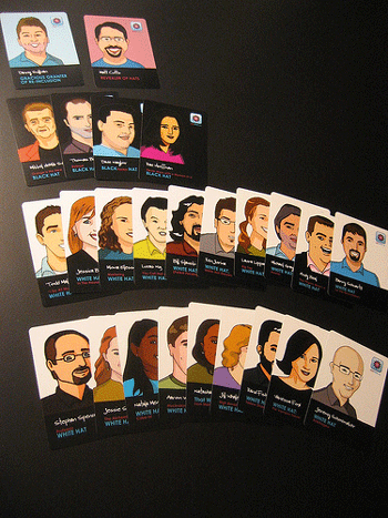 One of Rand's friends who's also an artist drew caricatures of several well-known SEOs and search engine reps. These folks were divided into the White Hat and Black Hat players, with Danny Sullivan being the Reinclusion Requester (the "healer") and Matt Cutts being the Revealer of Hats (the "seer"):