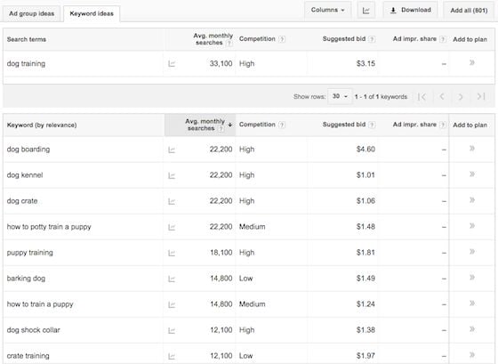 Second, you can research keywords for your industry, determine which ones would make for great content, and use those as a basis for your topic ideas. For example, let's say you wanted to create a website about dog training. If you search this on Google AdWords Keyword Planner, you can download 801 suggested keyword phrases, all with estimated search volume.