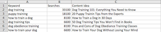 Take your downloaded spreadsheet and turn it into a content topic idea generator using the keywords that best fit your content goals.