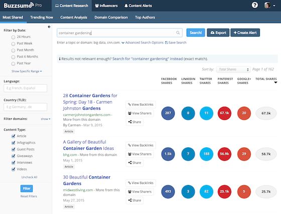 I like to use premium tools like BuzzSumo and Impactana for this. Here's how it works. You take the keywords you want to write about, and you search for them using these tools. BuzzSumo will show which sites have the most socially-shared posts matching those keywords.