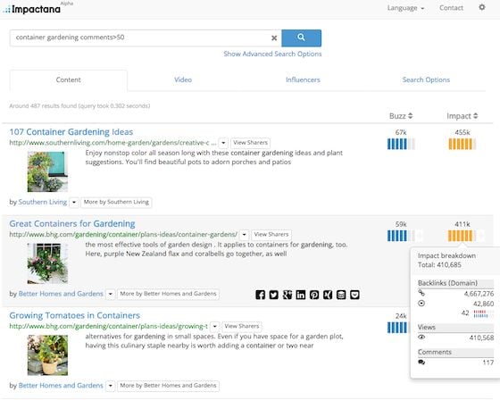 Impactana will go deeper and allow me to search for sites that have posts matching those keywords with lots of comments, views, backlinks, and other metrics.