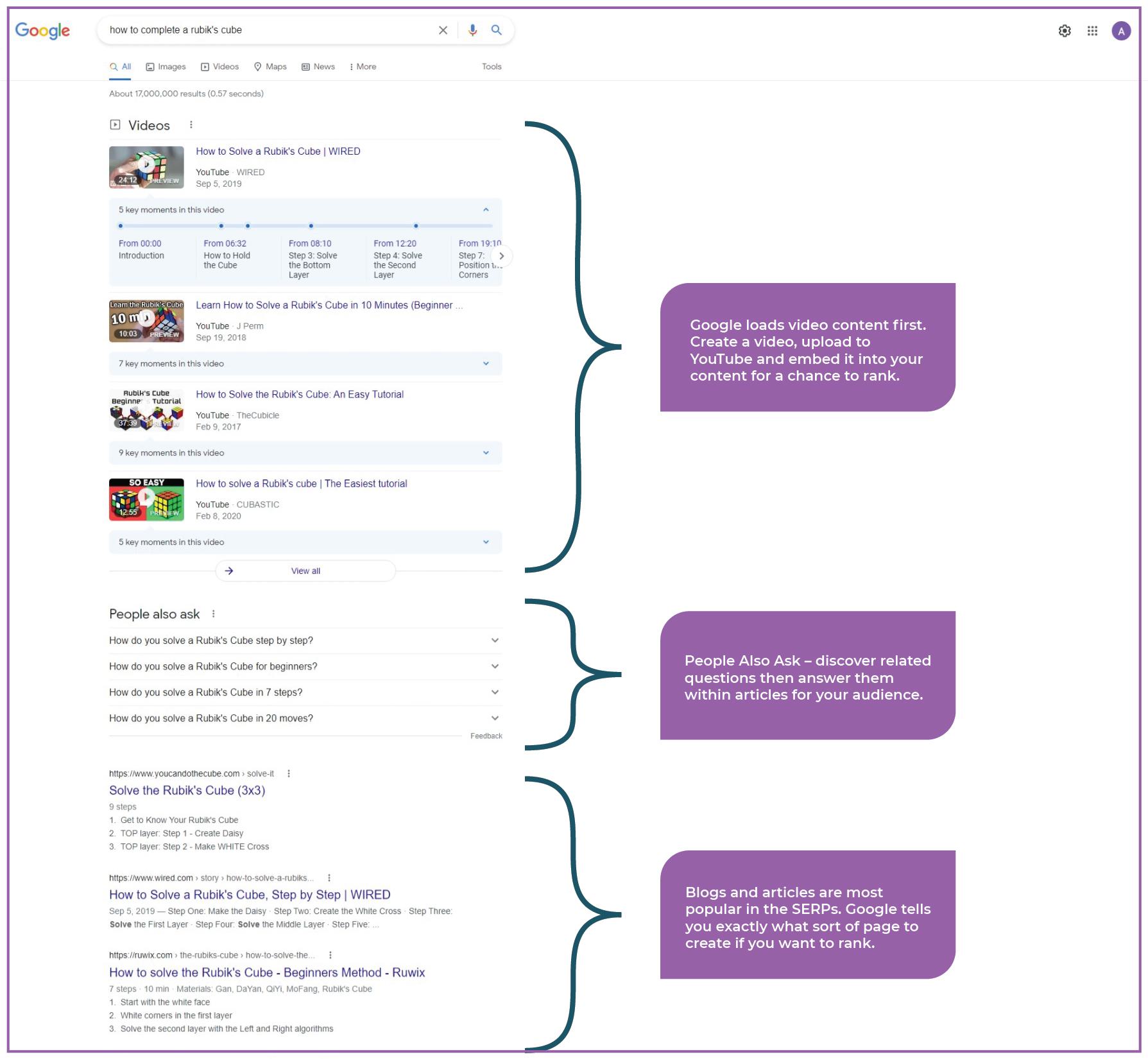 Pictured: an example of Google SERP for keyword: “how to complete a Rubik’s Cube”.
