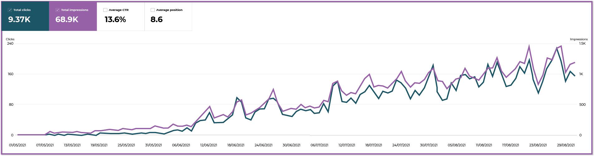 Keyword clustering is powerful. The graph below shows one article’s journey in Google SERPs. It ranks for 50 clustered keywords and includes questions from PAA. This article quickly achieved a featured snippet, image rankings, 9.37k clicks, 68.9k impressions, 13.6% CTR and an average of six minutes spent on the page. Oh, and this was achieved before a single website back-linked directly to the article.