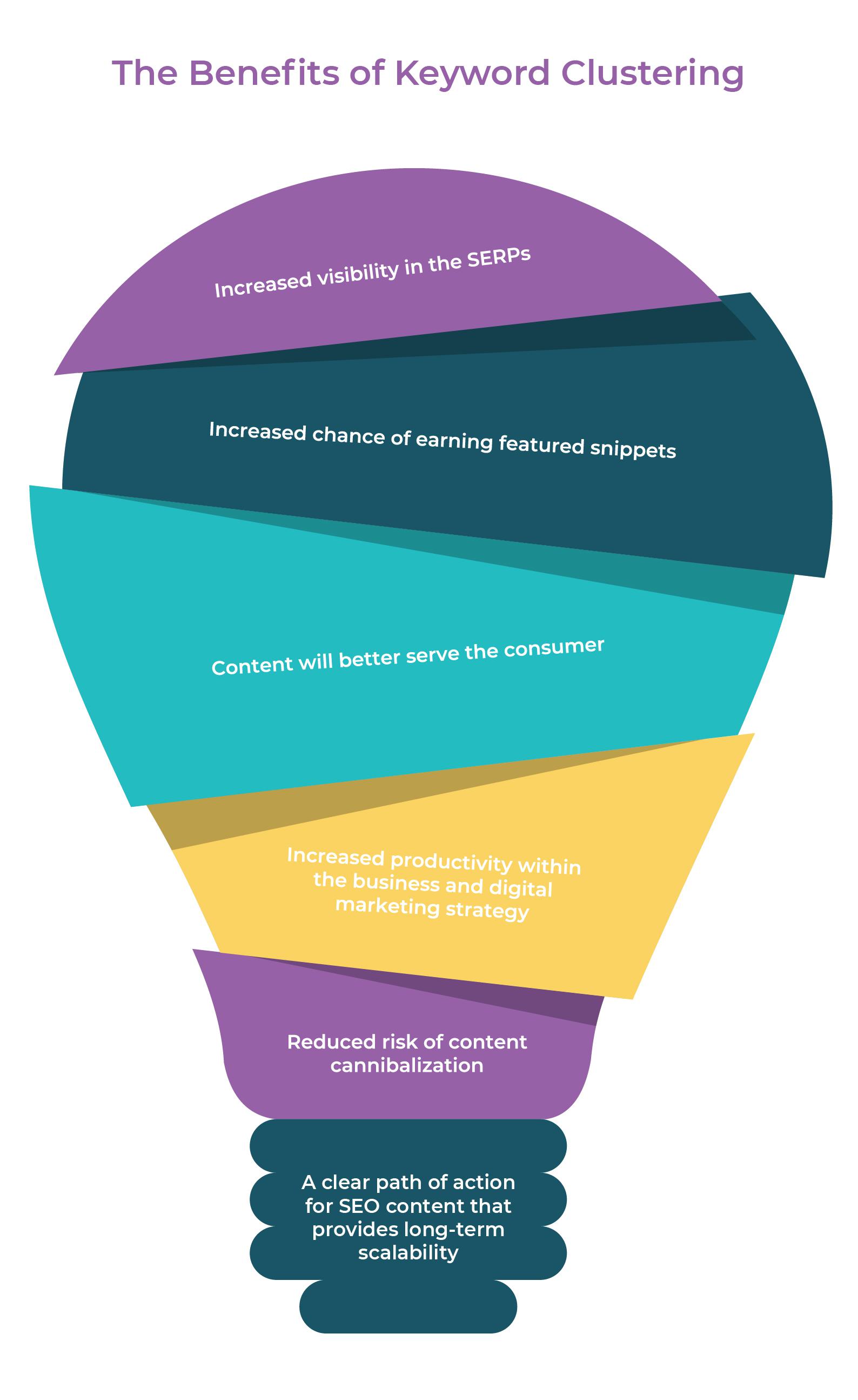 The main benefit is objective planning for content. If you use keyword clustering to create a clear plan of action for SEO content for every single page on your website and jot down suitable content ideas for the future, you’ll be left with long-term scalability, since you have keywords to target over time that can be scaled indefinitely.
