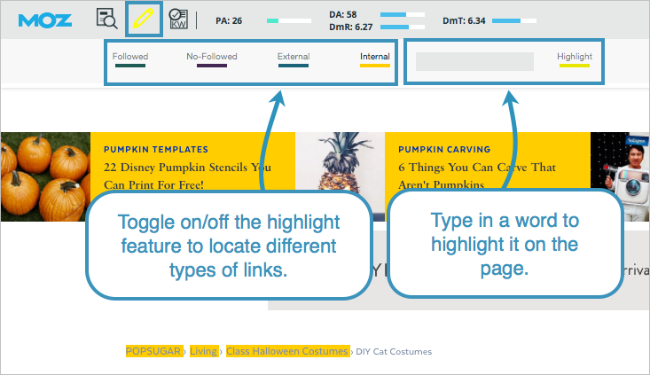 You can get your paws on DA free through Moz's Link Explorer, the MozBar (Moz's free SEO toolbar), or in the SERP Analysis section of Keyword Explorer. I like to keep MozBar on DA mode so I can check this metric out as I scoot about the web.