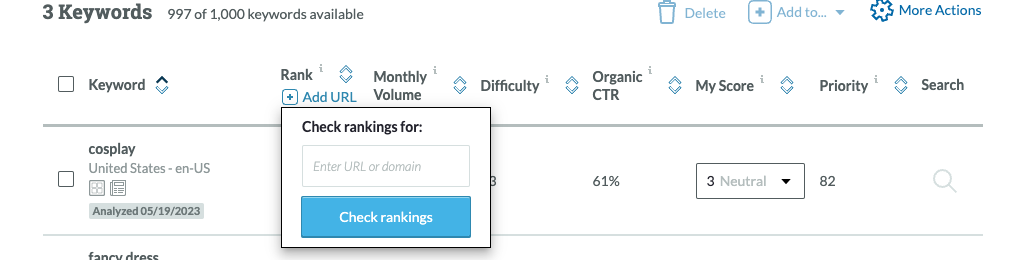 Open up your keyword list, click +Add URL to check your rankings to see if you're on page 1.