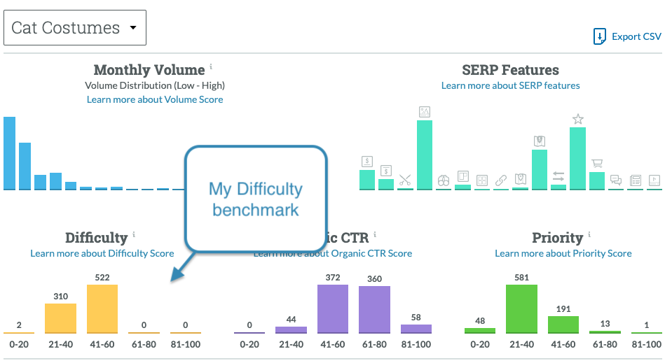 Moz’s Keyword Difficulty score uses the top 10 organic results to calculate the Difficulty metric. It’s a score out of 100, where a higher number means that the competition is strong, and it may take you longer to see results from your efforts. Every search you bash into Keyword Explorer shows you the Difficulty score from the Keyword Overview, and you can build these into lists so you can compare related keywords.