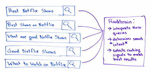 Now, RankBrain is going to help Google understand that each of these queries, despite the fact that they use slightly different words and phrasing or completely different words, with the exception of Netflix, that they should all be answered by the same content or same kinds of content. That's the part where Google, where RankBrain is determining the searcher intent. Then, Google is going to use RankBrain to basically say, "Now, what signals are right for me, Google, to enhance or to push down for these particular queries?"