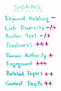- It's no longer the case, as it was probably five, six years ago, that one set of fixed inputs no longer governs every single query. Because of this weighting system, some queries are going to demand signals in different proportion to other ones. Sometimes you're going to need fresh content. Sometimes you need very in-depth content. Sometimes you need high engagement. Sometimes you don't. Sometimes you will need tons of links with anchor text. Sometimes you will not. Sometimes you need high authority to rank for something. Sometimes you don't. So that's a different model.