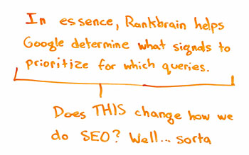 Does that actually change how we do SEO? A little bit. A little bit. What it doesn't do, though, is it does not say there is a specific way to do SEO for RankBrain itself. Because RankBrain is, yes, helping Google select signals and prioritize them, you can't actually optimize for RankBrain itself. You can optimize for these signals, and you might say, "Hey, I know that, in my world, these signals are much more important than these signals," or the reverse. For a lot of commercial, old-school queries, keyword matching and link diversity and anchor text are still very, very important. I'm not discounting those. What I'm saying is you can't do SEO for RankBrain specifically or not in the classic way that we've been trained to do SEO for a particular algorithm. This is kind of different.