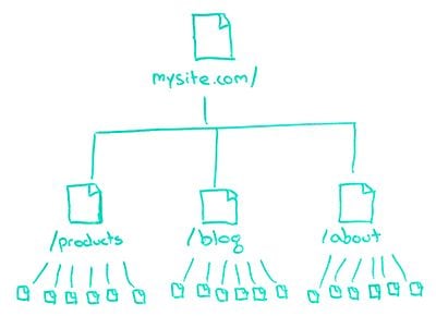 So, for example, if on my site.com I have these three — this is a very simplistic website — but I have these three subfolders: Products, Blog, and About. I might have a page in my products, 14axq.html, and it has certain metrics that Google associates with it through activity that they've seen from browser data, from clickstream data, from search data, and from visit data from the searches and bounces back to the search results, and all these kinds of things, all the engagement and click data that we've been talking about a lot this year on Whiteboard Friday.