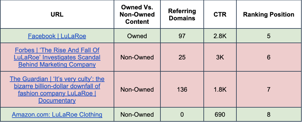 For LuLaRoe’s case specifically, here’s some of the data we found from the SERPs: