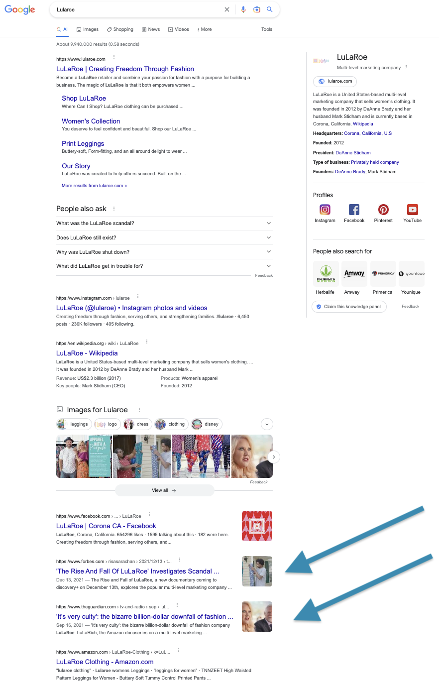 Back in September 2021, a couple very authoritative news sites, Forbes and The Guardian, published stories about the “downfall of the company” based on the documentary The Rise and Fall of LuLaRoe, which came out that December. While this is not necessarily a company we would take on as a client, we are using them as an example as there are specific ORM strategies that we could identify to help improve the SERPs for their brand name.
