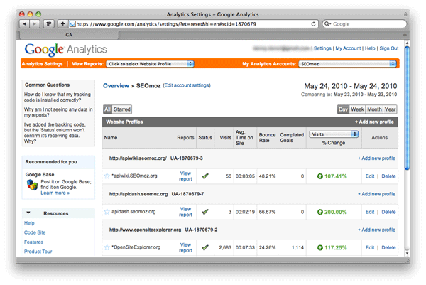 Profiles, on the other hand, are like files on a computer. They can't contain additional profiles or accounts. They represent one view of a website (although not necessarily the only view). An example of a profile might be api.seomoz.org or SEOmoz minus Office IP addresses. You can limit a profile to whatever view of a website you want by using filters.