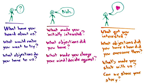 For people who sort of walked away, they maybe tried or they didn't get all the way through trying, but they walked away, they didn't end up converting or they didn't stick with it, we could say: "What made you initially interested? What objections did you have, and how did you overcome those? What made you change your mind or decide against this product?" Oftentimes that's a mismatch of expectations versus what was delivered.