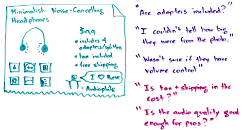 So if you hear, for example, "Hey, I didn't buy this because I wasn't sure if the right adapters would be included for my devices," or, "I travel on planes a lot and I didn't know whether the headphones would support the plane use that I want to have," great, terrific. We're going to include what the adapters are right on there, which airlines they're compatible with, all that kind of information. That's going on the page.