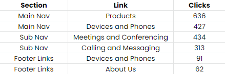 I analyzed three months of event tracking data from Google Analytics and Hotjar to determine exactly how users interacted with the product page. To narrow the results, I only focused on page elements with a call to action or internal link to pages that may lead to a conversion, such as the client’s demo page or case study archive.