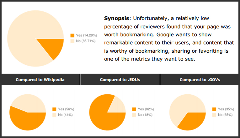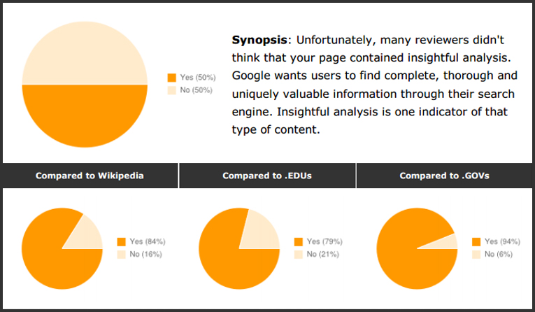 Google wants to send users to web pages that are uniquely useful, not just unique and not just useful. Unfortunately, press release sites uniformly fail on this front. On average, only 50% of reviewers found that BusinessWire.com content contained insightful analysis. Compare this to Wikipedia, EDU and Government websites which, on average, score 84%, 79% and 94% respectively, and you can see why Google might choose not to favor their content.