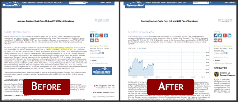 But does this have to be the case? Of course not. Press release websites like BusinessWire.com have first mover status on important industry information. They should be the first to release insightful analysis. Now, press release sites do have to be careful about editorializing the content of their users, but there are clearly improvements that could be made. For example, we know that use of structured data and visual aids improves performance on this question (ie: graphs and charts). BusinessWire could extract stock exchange symbols from press releases and include graphs and data related to the business right in the post. This would separate their content from other press release sites that simply reproduce the content verbatim. There are dozens of other potential improvements that can be added either programmatically or by an editor. So, what exactly would these kinds of changes look like?