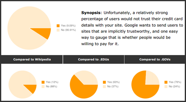 This is one of the most difficult ideals to measure up to. E-Commerce sites, in general, perform better automatically, but there are clear distinctions between sites people trust and don't trust. Press release websites do have an e-commerce component, so one would expect them to fare comparatively well to non-commercial sites. Unfortunately, this is just not the case. PR.com failed this question in what can only be described as epic fashion. 91% of users said they would not trust the site with their credit card details. This isn't just a Panda issue for PR.com, this is a survival-of-the-business issue.