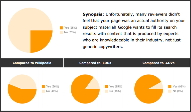 The Panda algorithm was a ground-breaking shift in Google's methodology for addressing certain search quality issues. Using patented machine learning techniques, Google used real, human reviewers to determine the quality of a sample set of websites. We call this sample the "training set". Examples of the questions they were asked are below: