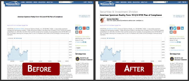 Notice in the new design that we have created the "Securities & Investment Division", added an editor with a fancy title "Business Desk Editor" and a credentialed by-line. You could even use authorship publisher markup. The page no longer looks like a sparse press release but an editorially managed piece of news content in a news division dedicated to this subject matter. Authority done.