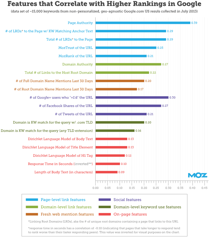 As you can see, while on-page features like keyword use in titles, keywords, and body text (even when measured via a more sophisticated and higher correlating model than just raw usage like our data science team did in the ranking factors) have reasonable correlations given the complexity of Google's rankings, other elements are found much more often in higher- vs. lower-ranking pages.
