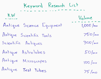 Well, maybe, I'm using an example here around antique science equipment. So you see these various terms and phrases. You've got your volume numbers. You probably have lots of other columns. Hopefully, you've watched the Whiteboard Friday on how to do keyword research like it's 2015 and not 2010.