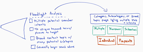 Now, these are going to feed into your IA, your information architecture, and your site structure in this way. So floodlight content generally sits higher up. It's the category or the subcategory, those broad topic terms and phrases. Those are going to turn into those broad topic category pages. Then you might have multiple, narrower subtopics. So we could go into lab equipment versus astronomical equipment versus chemistry equipment, and then we'd get into those individual pinpoints from the pinpoint analysis.